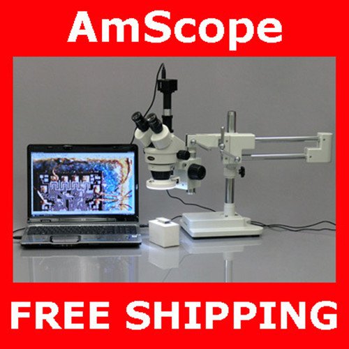 This is a trinocular 7X-45X zoom stereo boom microscope with 1.3 Megapixel high resolution USB2.0 color digital camera. It comes with a trinocular head with 30mm SUPER widefield, high-eyepoint 10X eyepieces, a 3D double-arm heavy-duty boom stand, and an 80-LED ring light with dimmer. The microscope offers crystal clear sharp images, super widefield of view, large magnifying zoom range and large working distance. Its high-eyepoint optic design ensures an easy and comfortable observation, especially for eyeglass wearers. The color digital camera captures 1.3MP high resolution microscope images and displays them as full-screen live video on your computer screen. Its built-in reduction lens gives your computer screen the same field of view images as those seen through the microscope eyepieces. With the included user-friendly software, which is compatible with Windows XP/Vista/7, you can edit microscope images in the same way as you use PhotoShop. You can conduct measurements across images, record videos, share images, and save them in BMP, TIFF, JPG, PICT, PTL and other formats. You can conduct measurements across microscope images, measuring lengths, angles, areas and etc. The 3D double-arm boom stand allows you to turn the microscope head around three different axis (x, y, and z), allowing you to point the microscope head in ANY direction you wish. The intensity-adjustable LED ring light provides bright, even and cool light illumination. This microscopy system is an ideal instrument for gemologists, engravers, collectors and anyone in semiconductor and/or electronic industry. It is a right microscope for biological laboratory applications that require low heat release. This stereo zoom microscope is made by the same technicians and on the same production line that makes optical instruments for Leica, Zeiss, Nikon and Olympus. It is brand new in factory sealed boxes. The retail value of this microscope is ,000.