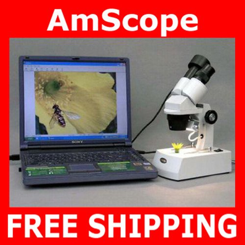This binocular stereo microscope comes with a 1.3M (1280x1024) pixel USB2.0 digital camera. It has four magnification power settings, 10X, 15X, 30X & 45X, and a versatile illumination system that provides both incident (top) lighting and transmitted (bottom) lighting. You can choose between incident illumination shining down onto the object or transmitted illumination through the frosted stage plate. The first is used for the observation of three-dimensional objects and the second for the observation of slides. This microscope offers high resolution and good depth within a broad field of view. It gives sharp clear stereo images. Its 45?inclined binocular head ensures an easy observation and rubber eyeguards provide further comfort. The digital camera captures microscope images and displays live video on your computer screen. With the user-friendly software included, compatible with Windows 2000/XP/Vista/7, you can edit microscope images in the same way as you use PhotoShop. You can record videos, capture still images, and save them in BMP, TIFF, JPG, PICT, PTL and other formats. You can also conduct length, angle, area and other measurements across images. It has a built-in reduction lens and gives the same field of view images on your PC screen as those seen through eyepieces. This microscope is a great instrument for many applications. It can be used in geology, forestry, archaeology, agriculture and biology. It is appropriate for educational purposes in hospitals and schools. It is great for the exploration of the world of surface details and fine structures of various materials like wood, metal, solder, semiconductor and stone. It is perfect for the examination of insects, plants, rocks, stamps, jewel, soldered points, microelectronic components or virtually any three dimensional objects. This scope is an ideal tool for watchmaker, jeweler, engraver, dies-maker, philatelist, students, and etc. It is brand new in factory-sealed box. Its retail value is 0.